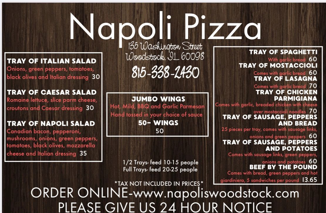 We treat you like family. Round or deep dish deep dish $1 extra. Everything is fresh daily, and all of our authentic italian dishes are reasonably priced. Click below for more options. Free delivery until 3 am. We are the number one choice for pizza in palatine, illinois. 1 extra large special pizza, 16 chicken wings, garlic bread with cheese. White pizza with garlic oil sauce, romano cheese, mozzarella cheese, ricotta cheese & fresh basil. Pizzeria napoli, traditional italian pizzeria, 10 dolman street, breslau, ontario. Pepperoni, meatball, fresh mushrooms, sausage, fresh peppers, onions, anchovies. Napoli special 7 item pizza. From pizzas to pastas to subs and salads.' menu order online we deliver beer & wine menu come visit us! Prosciutto, ham, bacon strips, mushrooms, green peppers, red roasted peppers, onions.